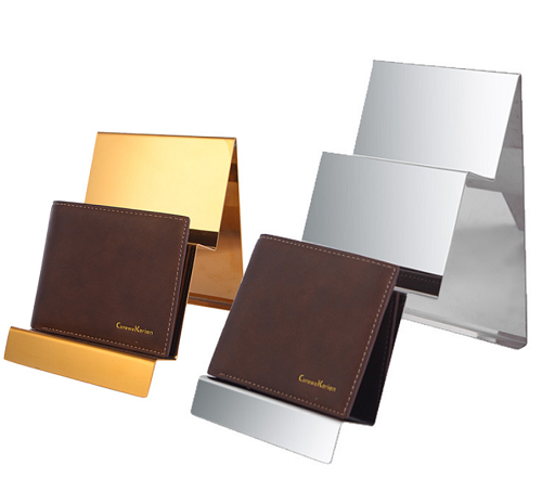 Trapezoidal counter display rack for clutches, multi-layer leather bag display props, stainless steel wallet display stand for leather goods stores